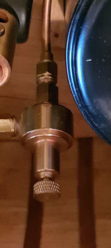 Das Vakuumventil ist an all meinen Kesseln verbaut. Wenn der Kessel nach Nutzung abkühlt, bildet er ein Vacuum im Kessel, weil verbliebener Restdampf kondensiert. Dieses Vacuum zieht, wenn man vergisst das Dampfventil zu schließen, Dampföl aus dem Öler im den Kessel. Das ergibt dann eine ziemliche Sauerei, weil das Öl das Schauglas des Wasserstandes verschmutzt und überall im Kessel seine Spuren hinterlässt. Das Vakuumventil besteht aus einer Stahlkugel mit O-Ring-Dichtung. Der sich aufbauende Dampfdruck drückt die Kugel in den O-Ring und verschließt das Ventil. Wenn kein Druck im Kessel ist, fällt die Kugel und öffnet das Ventil, so das kein Vacuum gebildet werden kann.