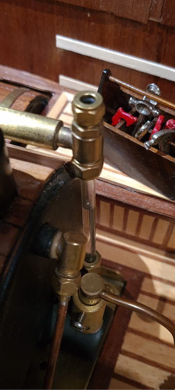 In der Dampfbarkasse „Luisa“ ist im Vorschiff ein Wassertank aus Messingblech eingebaut. Der Tank  ca 250ml, reicht also aus für eine komplette Kesselfüllung. Oben auf dem Kessel ist ein fasstRückschlagventil eingeschraubt, welches über die Handpumpe mit dem Tank verbunden ist. So kann bei kurzem Stop am Steg Wasser nachgefüllt werden. Pumpe und Ventil sind von Clevedon Steam.