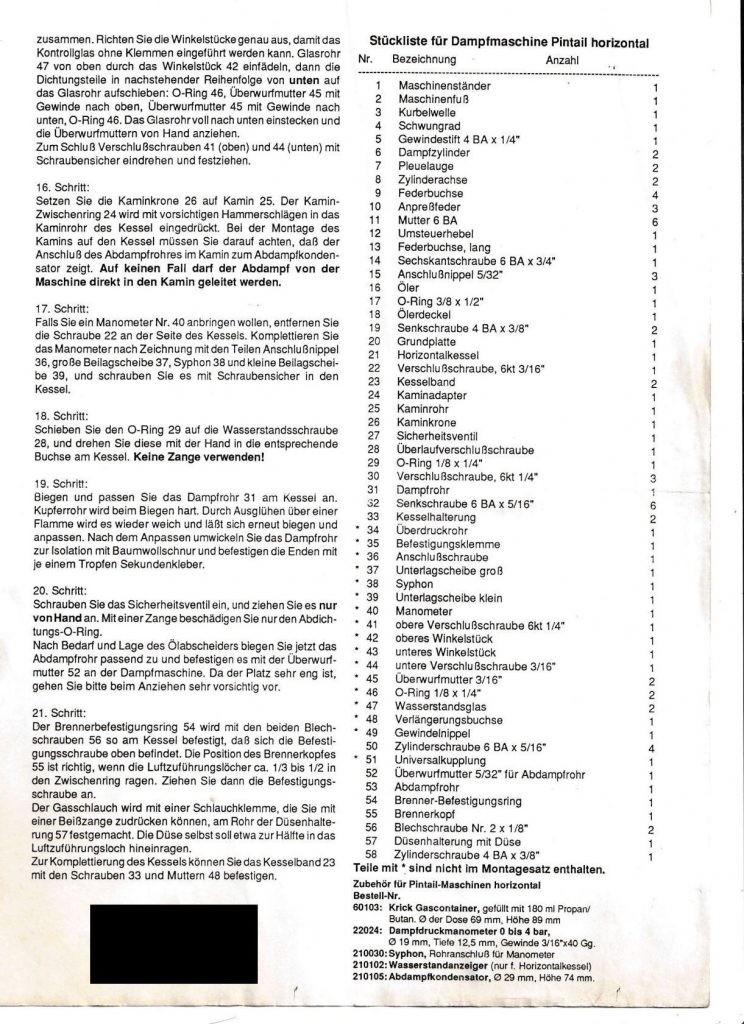 Die Pintail ist eine oszillierende 2 Zylinder V Maschine und hat einen sehr einfachen Aufbau, der aus dem Bild ersichtlich ist. Die Zylinderachsen sollten mit Schraubensicherung in die Zylinder eingeschraubt werden. Die Zylinder werden mit mit Federbuchsen und Federn an den Maschinenständer gezogen. Ich habe zum Abschluss mit 2 Muttern gekontert und ca 1,5mm Gewinde freigelassen. So läuft die Maschine gut und verliert nicht unnötig Dampf.