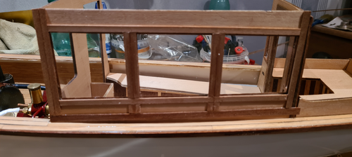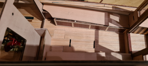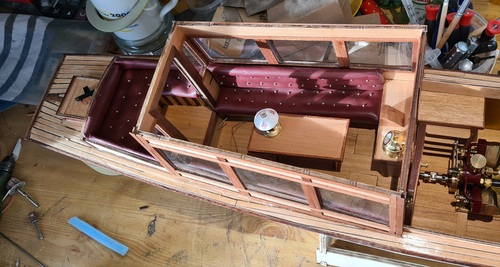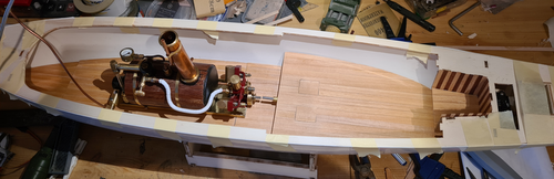 Hier ist auch schon das Deck mit 0,5x5mm Tanganjica beplankt. Kalfaterung aus 0,5mm Takelgarn. Die Königsplanke ist aus Mahagoni. Das Spantgerüst unter den Böden ist verklebt. Die Kabinenwände sind nur probeweise eingesteckt. Ich habe den Maschinenboden 3 geteilt. Weil unterdem Boden 2 Servokabel für das Gasabsperrventil und das Pfeifenservo laufen, sollte der Mittelteil entnehmbar sein. Der Boden geht eigentlich von der Kabinenvorderwand bis in den Bug. Im Bug wird aber noch ein Schott eingesetzt und vor der Kabinenwand wird in der Treppe das Mikroservo für die Maschinenumsteuerung versteckt. Die Maschine und der Kessel sind auf der Grundplatte aus Messing verschraubt. Die Grundplatte wird mit 2 M4 Messingschrauben in Einnietmuttern befestigt. So muss nur der Gabelkopf an der Maschine gelöst werden und alles ist entnehmbar.