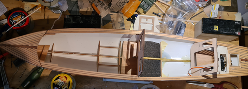 Der Maschinenboden ist beplankt, der Kabinenboden auch. Das Deck wurde mit den Spanten und Unterzügen versehen. Die Plicht wird jetzt auch schon eingesetzt, genauso wie das Ruderservo. Hier kommt man später nur schlecht heran. Dann das Deck mal zur Probe aufgelegt und mit Kreppband fixiert. Wie man sieht ist auch für den horizontalen Kessel ausreichend Platz vorhanden. Der Kiel ist schon angeklebt und die Welle und das Stevenrohr wurden ca 50mm gekürzt, sonst kommt die Maschine zu weit nach vorn und ich habe nicht ausreichend Platz für den Gastank.