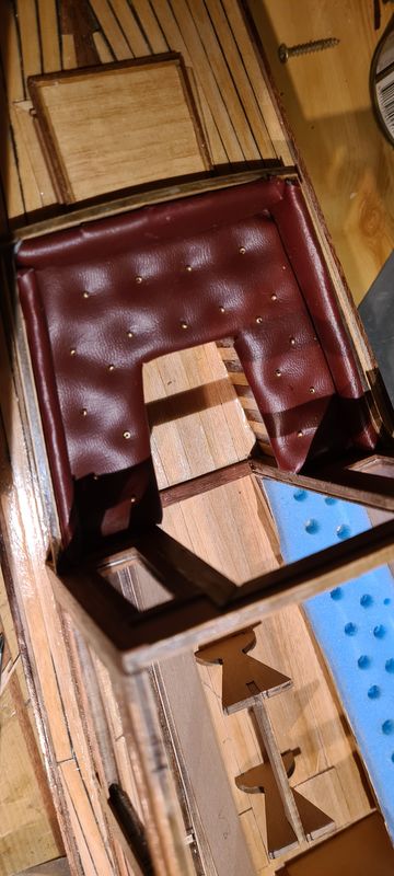 Hier schon mal die Polsterung der Bänke in der Plicht aus Kunstleder mit 2mm Perlen abgesteppt.