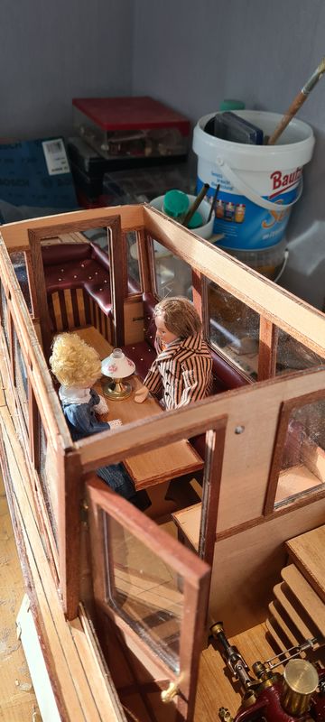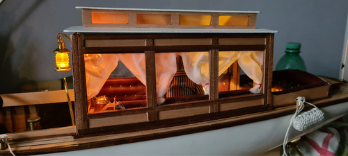 Hier noch die Bänke im Rohzustand. Die Sitzflächen werden nur aufgelegt. In den Kasten an der Vorderwand kommt der Ein/Aus-Schalter und der Empfängerakku. In die Sitzbank an Backbordseite der Empfänger, die Konstantstromquellen der LED-Beleuchtung und der Stepupregler für die Wandlampe.