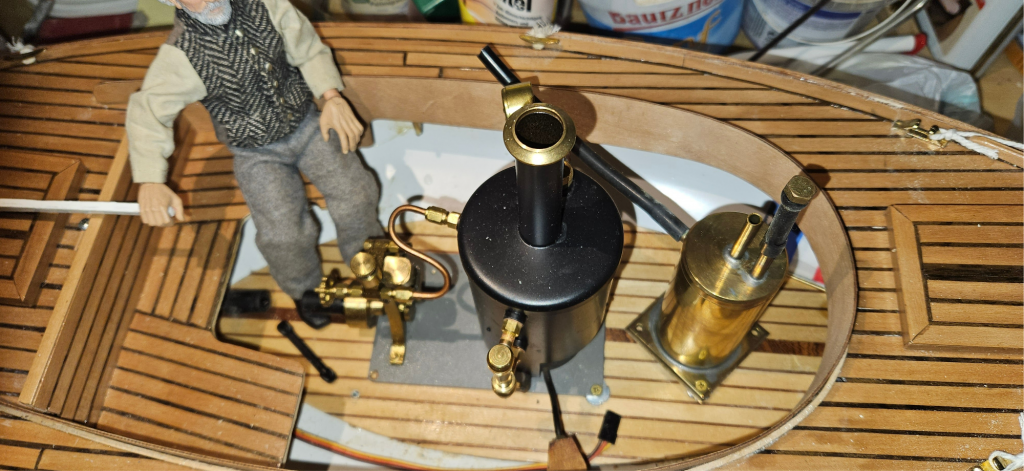 Die Dampfanlage Anna im Vertrieb von Krick, produziert von Regner-Dampftechnik ist eine Anfänger/Einsteiger Dampfmaschine mit Kessel. Sie besteht aus einem mit Esbit oder Brennpaste beheizten Stehkessel und einer oszillierenden Ein-Zylinder Maschine. Sie hat genug Leistung um ein kleines Modell wie die Anna von Krick bzw. meine Nordwind anzutreiben. Diese Anlage wurde mir günstig von meinem Modellbaukollegen Jürgen angeboten und so kam ich zu einer neuen Maschine. Die Maschine ist nicht umsteuerbar und kann nicht in der Geschwindigkeit geregelt werden, auch läuft Sie bei Stillstand nicht wieder an. Das birgt zwar alles ein gewisses Risiko, was ich aber wegen der Modellgröße und dem entsprechenden Fahrbereich vernachlässigen kann.