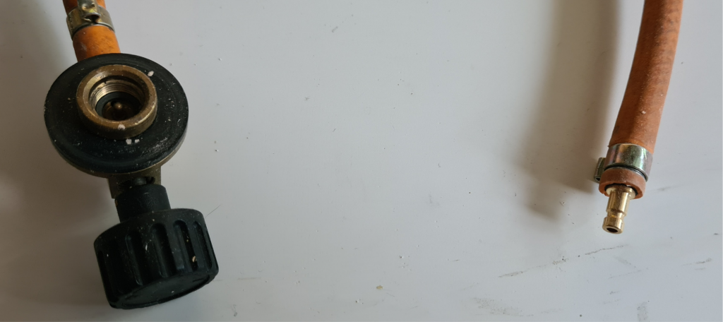 Zusammen mit meinem Modellbaukollegen Bernd versuchen wir das Problem mit Pneumatik-Kupplungen zu lösen. Die Verbindung zum Gasbehälter wird über einen handelsüblichen Gasschlauch mit passendem Anschluss hergestellt.
