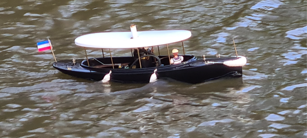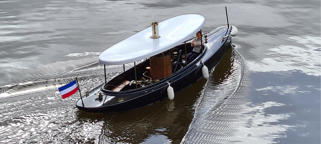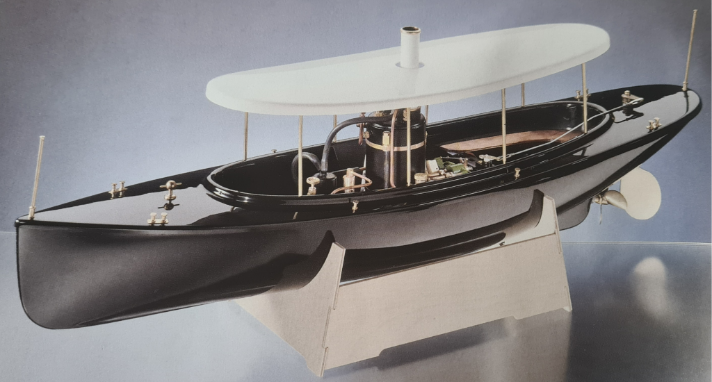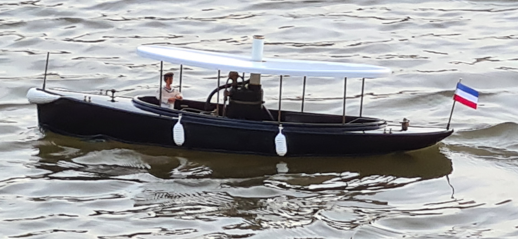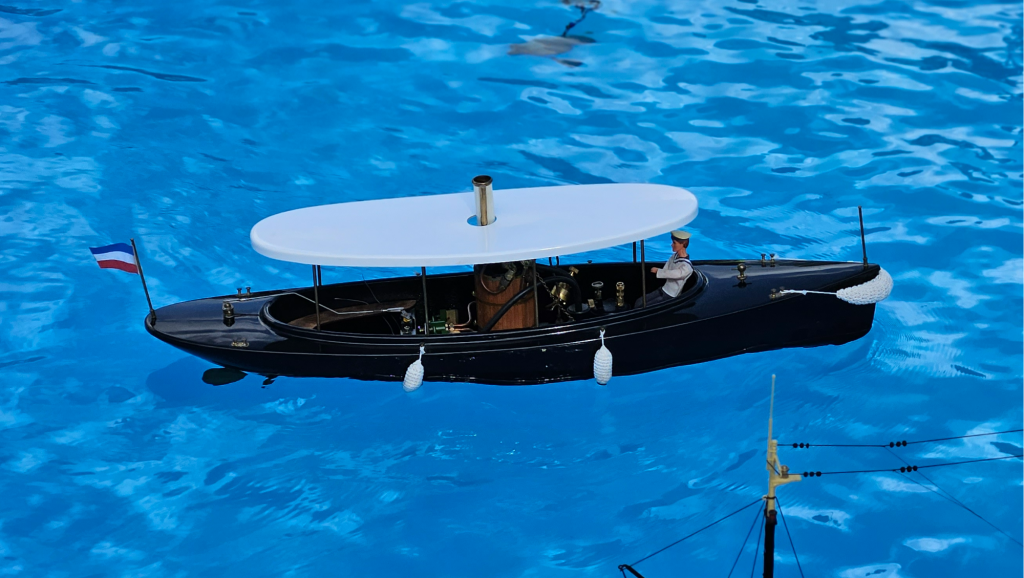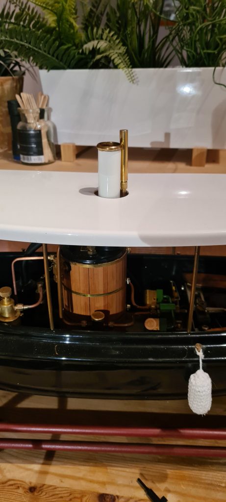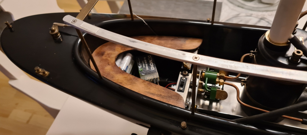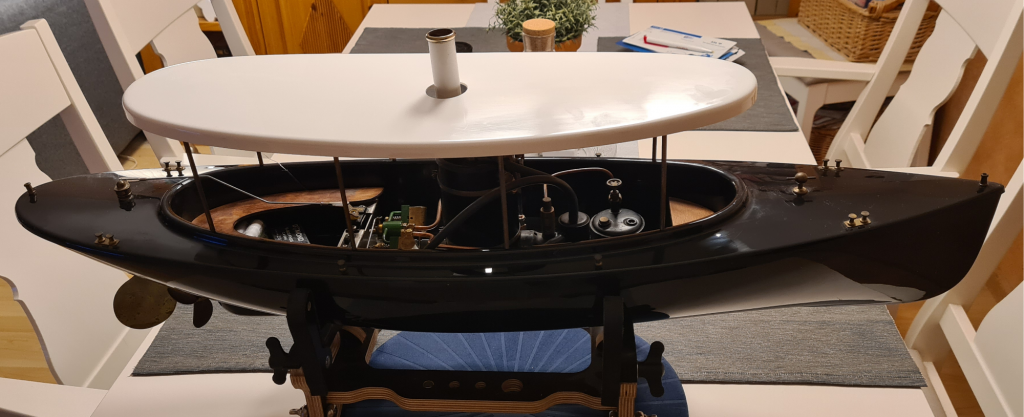 Das Modell musste etwas gereinigt und die Maschine gewartet, der Kessel entkalkt werden. Das ist aber nach vermutlich mehrjähriger Standzeit normal. Rumpf und Deck sind aus schwarzem ABS in Hochglanz, die Beschläge aus Messing.