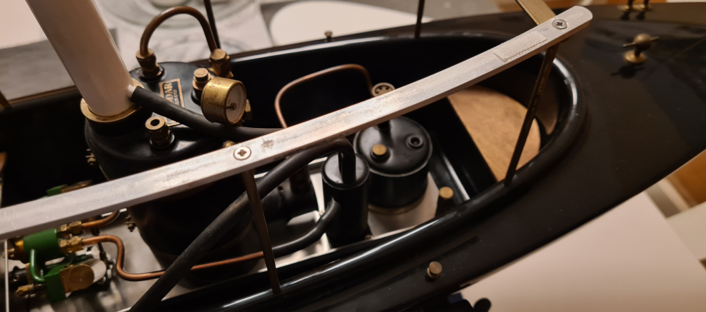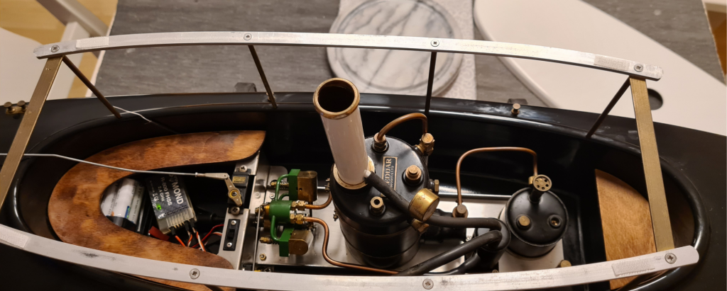Die Dampfanlage inkl Servos ist auf dem Maschinen-Fundament montiert und als Einheit entnehmbar. Die Ansteuerung des Ruders ist sehr pragmatisch und keine optische Schönheit, aber was solls….