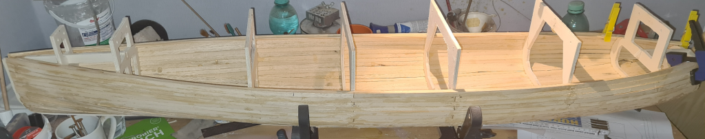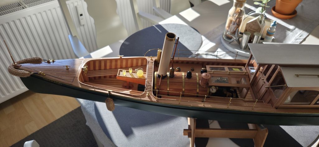Ich bin mit dem vorderen Cockpit angefangen und habe die Verkleidungen des Bugspants und die Verkleidung des Spants zwischen dem vorderen Cockpit und dem Maschinenraum gebaut. Die Basis besteht aus 1mm Sperrholz, beplankt mit Leisten aus Birne und Linde. Der Spant zum Maschinenraum hat einen Durchlass für den Brenner und die Gasleitung. Ich muss schauen ob ich einen modernen 28mm Brenner oder einen alten Rohrbrenner von Cheddar verwende. Grund ist der notwendige Platz im vorderen Cockpit. Auch dessen Seitenwände sind aus 1mm Sperrholz mit Beplankung. Der Boden und die beiden bänke müssen entnehmen bleiben, weil unter dem Boden Teile der Gasregelung untergebracht werden.