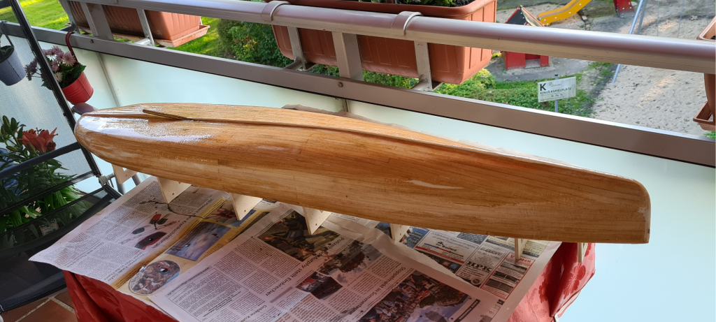 Seit einigen Wochen geht es aber weiter. Ich habe den Rumpf noch mal an einigen Stellen gespachtelt und geschliffen. Ich hasse spachteln und schleifen, aber es musste sein.