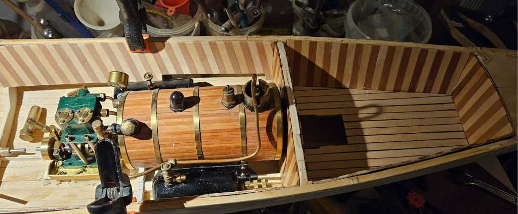 Zur Befestigung des Kessels und der Maschine wurden Holzleisten mit M3 Einschlagmuttern versehen, so das beides verschraubt werden kann. Der Gastank und der Kondensator liegen rechts und links neben Kessel und Maschine. Die Gasleitung wird unter dem Kessel hindurch zu einem servobetätigten Gasventil geführt und durch die Gasregelung von Clevedon Steam gesteuert. Der Platz unter dem Boden im Maschinenraum ist sehr knapp, es wird eine Herausforderung die Servos zur Steuerung der Maschine und zur Betätigung der Pfeife unterzubringen.