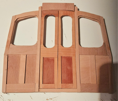 Die Kabinenvorder- und -rückwand mit den Doppeltüren wird aus Birnenleisten und 1mm Birnenholz gefertigt und besteht aus mehr als 50 Einzelteilen. Abgelängte Leisten in unterschiedlichen Längen und Breiten und ausgesägten Teilen aus 1mm Birne. Die 2 Seitenteile bestehen dagegen nur aus je 16 Teilen, 8 Teile Außenseite und 8 Teile Innenseite. Beide Teile werden dann mit Abstandsleisten zusammengefügt. Die 4 Eckpfeiler sind 2 teilig und wurden aus Leisten zusammengesetzt, anschließend wurden mit der Kreissäge Nuten eingesägt. Die Grundplatte wird von beiden Seiten mit den Formteilen bestückt, die Scheiben werden von oben in die Zwischenräume der Wände eingeschoben. Sie sind aus 1mm Makrolon.