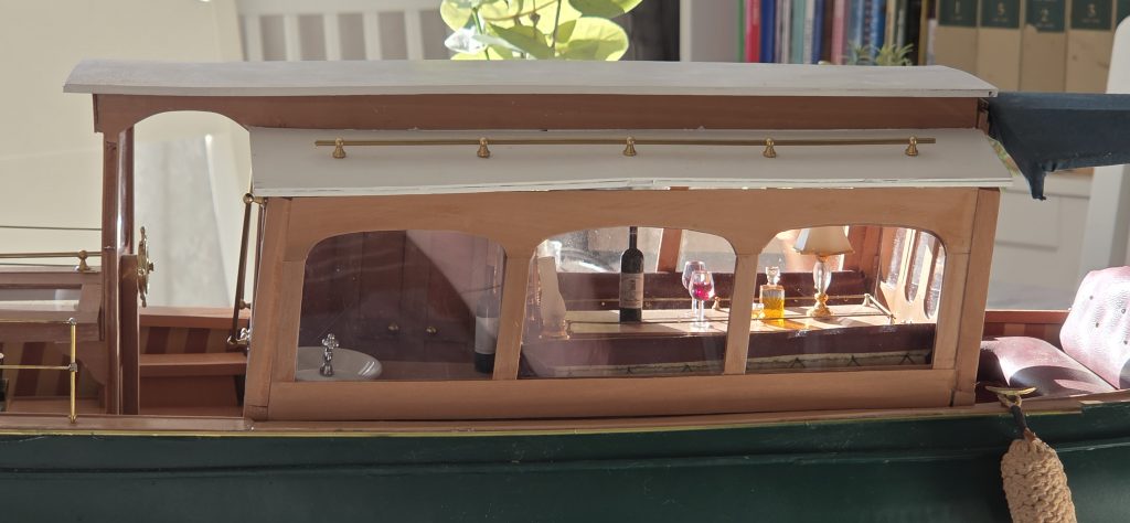 Als nächstes bin ich mit der Kabine angefangen. Sie hat ein abnehmbares Dach, vorn und hinten jeweils 2 Türen einen Salonteil mit Polsterbänken und einem Tisch. Im vorderen Bereich befindet sich die Galley, die Küche und auf der anderen Seite die Toilette mit einer weiteren Doppeltür. Im Salon sind 2 Wandlampen, die funktionstüchtig sein sollen. Da in den Sitzbänken die Fernsteuerelektronik verbaut wird, muss man an alles gut herankommen können. Die gesamte Stromversorgung besteht aus einem 2000mAh Empfängerakku mit 4 Zellen. Die Kabinenbeleuchtung wird über einen Step-Up-Wandler mit 12V betrieben.